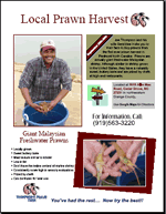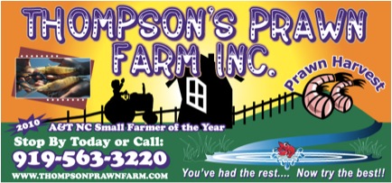 | Welcome to the Thompson's Prawn Farm website! North Carolina's own freshwater prawn producer. We're a licensed aquaculture provider, specializing in jumbo freshwater prawns. Prawns are a healthy source of nutrition and taste great! Go to our "Prawns" section to find out more information about the freshwater prawns we raise at Thompson Farms.